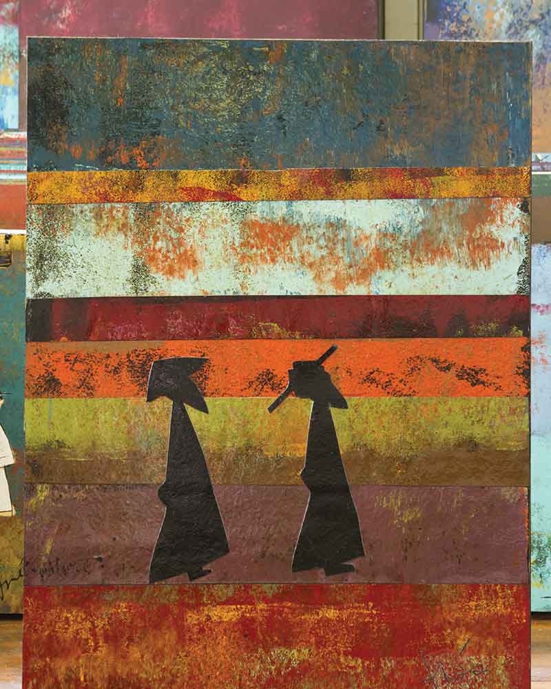 His paintings tell his story in a graphic form. “It’s a story about me as this person who is the ‘everyday man,’ sort of waiting for inspiration. And so at some point in the painting he meets [a man] who says, ‘Why don’t you take a walk in the woods,’ Trés says. “He wears a robe and after seeing the hawk, his robe becomes gold. The gold robe sort of symbolizes his transformation. He’s been enlightened or inspired.” The painting is a continuous series, in which the color palette goes from darker to brighter—just like Trés’ journey.