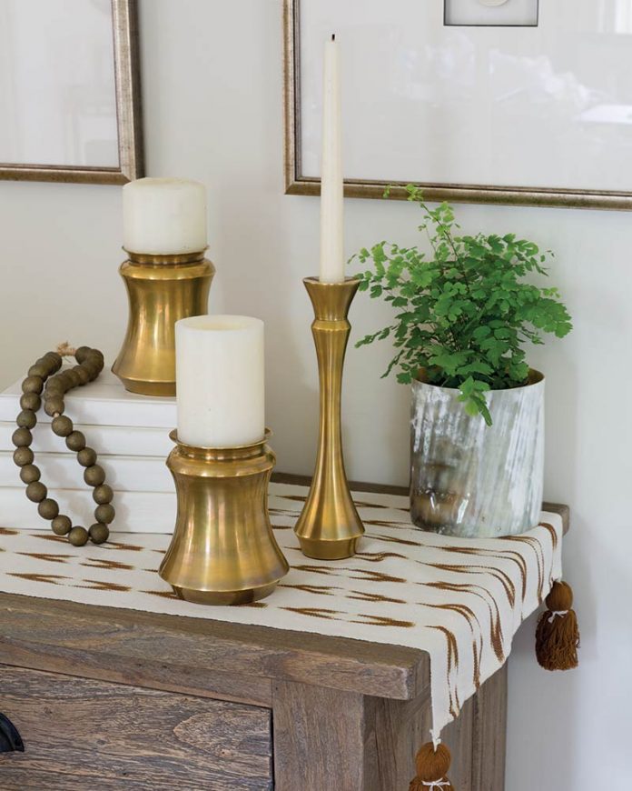 Candlestick and pillar holders from Serena & Lily, serenaandlily.com or 866-597-2742. Horn vase from Made Goods, madegoods.com or 626-333-1177. Table runner from Dear Keaton, dearkeaton.com or 800-935-7556.