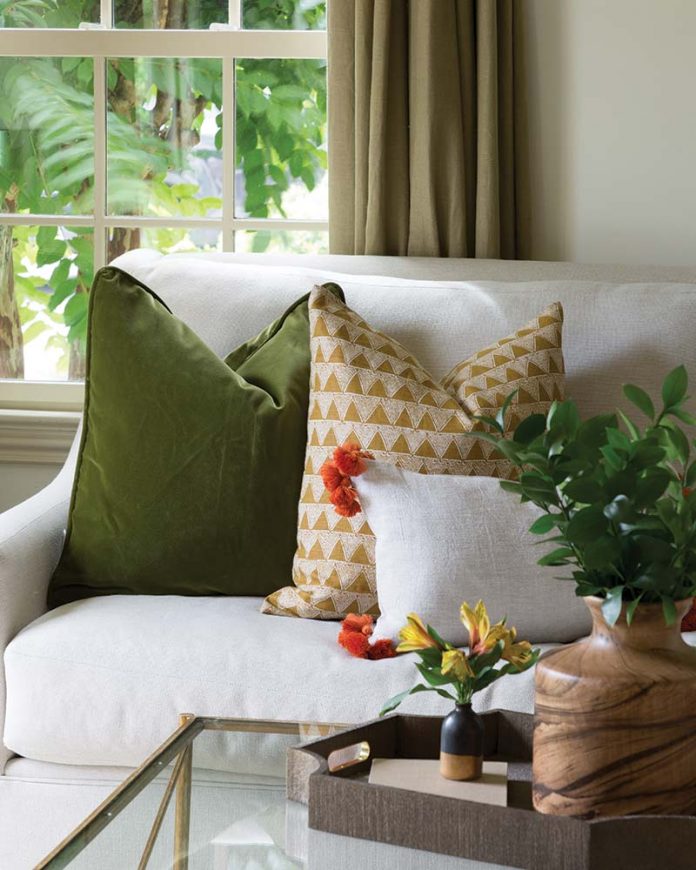 Green velvet pillow from Article, article.com or 888-746-3455. Gold printed pillow cover from Dear Keaton, dearkeaton.com or 800-935-7556. Orange tassel pillow cover from Serena & Lily, serenaandlily.com or 866-597-2742. Wooden vase and pewter faux silk tray from Made Goods, madegoods.com or 626-333-1177.