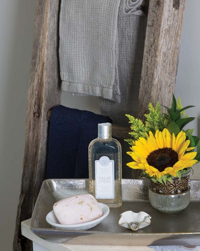 Silver tray from Target, target.com or 800-591-3869. Wavy ceramic dish from Susan Gordon Pottery, susangordonpottery.com. Bath soaps from Vietri, vietri.com or 919-245-4180. Waffle linen towels from Rough Linen, roughlinen.com or 800-968-0903.