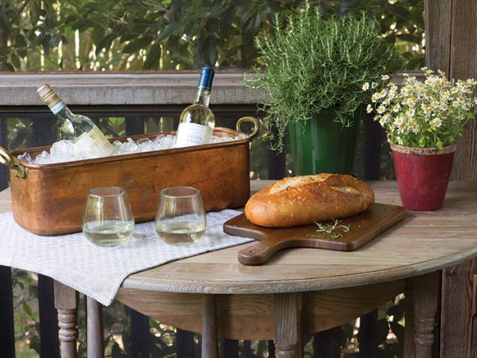 Copper drink tub from Williams Sonoma, williams-sonoma.com or 877-812-6235. Gray printed napkin from Pier 1, pier1.com or 817-252-6300. Green planter from Target, target.com or 800-591-3869. Cheese board from Pottery Barn, potterybarn.com or 888-779-5176. Stemless wine glasses from World Market, worldmarket.com or 877-967-5362.