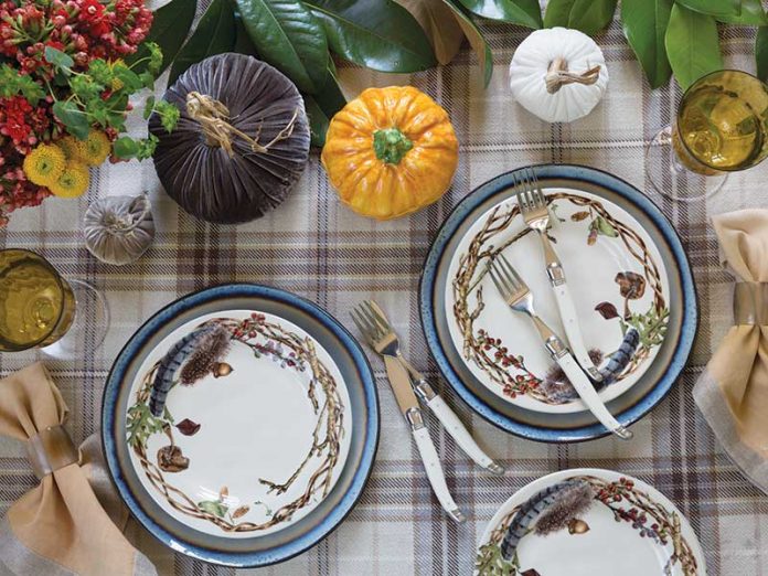 Ceramic pumpkin from Vietri, vietri.com or 919-245-4180. Natural and ivory-colored napkins from Kim Seybert, kimseybert.com or 877-564-7850. Forest party plates from Juliska, juliska.com or 888-551-7310. Napkin rings from Pier 1, pier1.com or 817-252-6300. Glazed dinner plates from World Market, worldmarket.com or 877-967-5362.