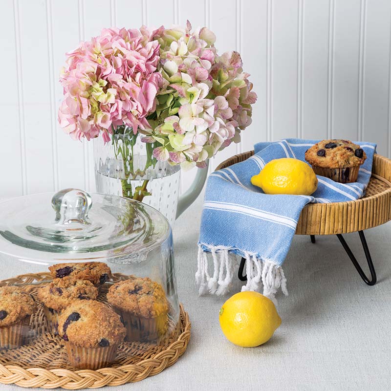 Woven pastry cloche from McGee & Co. Carafe from Lucy’s Market. Tea towel from Turkish-. Rattan riser from Farmhouse Fresh Home.