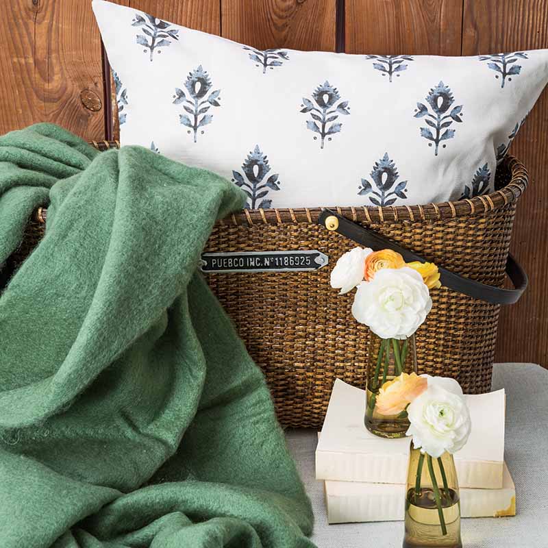 Throw from Crate & Barrel. Basket from Burke Decor. Pillow from McGee & Co. Bud vases from The Avenue.