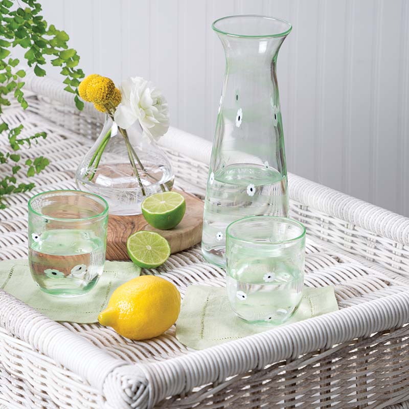 Bud vase from The Avenue. Carafe and wineglasses from Land of Belle.