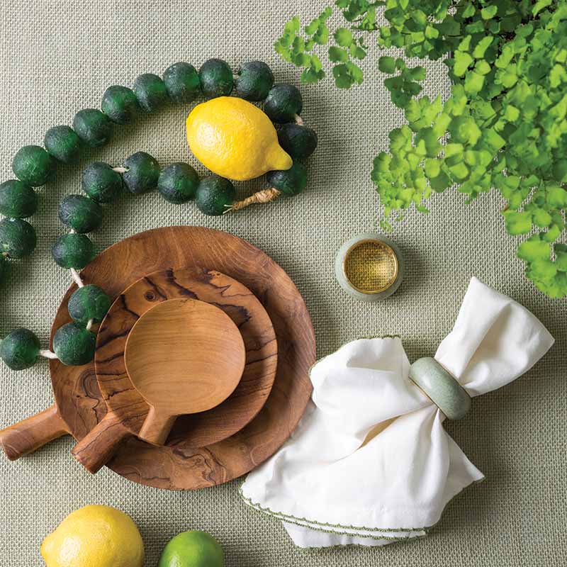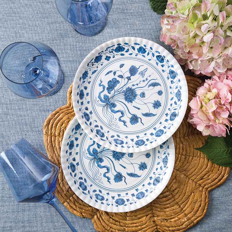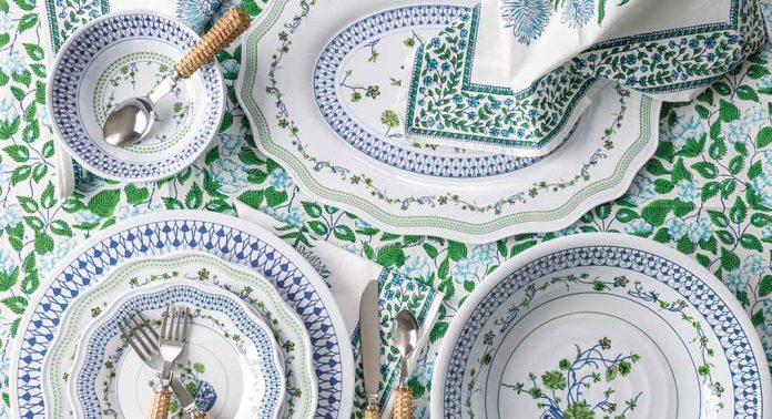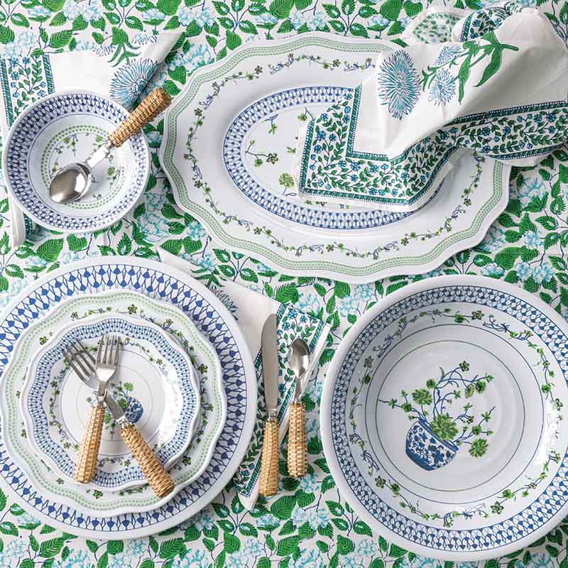 Melamine serveware and basket-weave flatware from The Enchanted Home. Tablecloth and napkins from Gatopard,.
