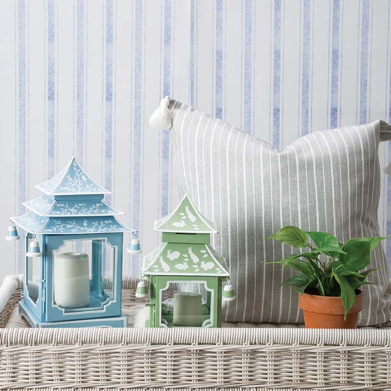 Wallpaper from Deny Designs. Painted pagoda lanterns from The Enchanted Home. Pillow and bar cart from Serena & Lily.