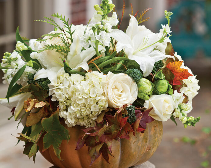 A mix of leaves, berries, and flowers tucked inside a pumpkin base creates a seasonal centerpiece fit for any occasion.