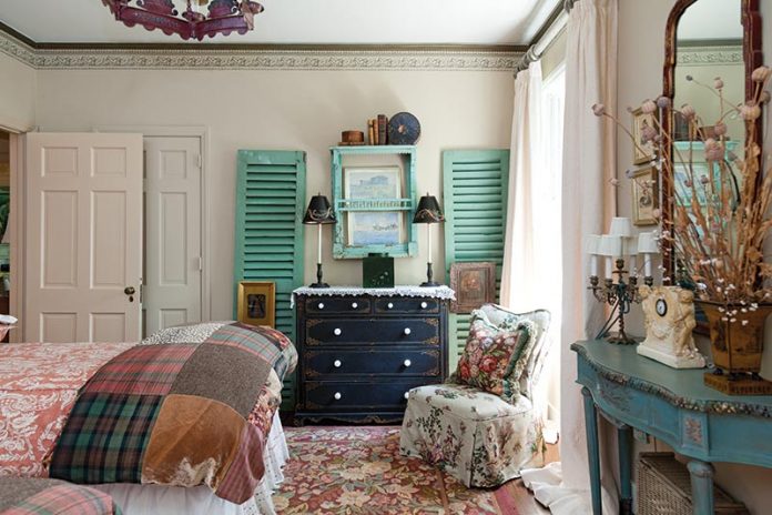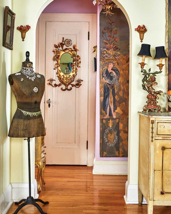 An antique dress form not only provides plenty of space to hold this homeowner’s collection of vintage rhinestone jewelry but also serves as a sparkling work of art in the home’s living area. See the rest of this home in our Vintage Cottage special issue!