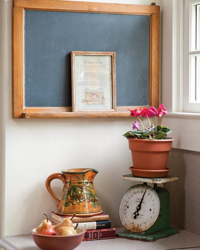 A weathered kitchen scale is a beautiful piece in itself, but it’s also the perfect place to display other favorite finds—or even a cheerful potted plant.