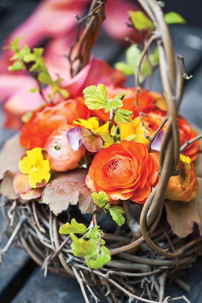 Baskets are made for wannabe bouquet artisans with no experience. The process is simplicity itself: take a basket (or whatever you can lay hands on), fit it with a paper cup or anything that will hold water, fill it halfway with water, and then tuck in the blossoms, cutting the stems very short to form a tight mound. If you’re all thumbs when it comes to arranging, try the trick of holding the blossoms steady by installing a base of foliage first, like coral bells, foamflower, lungwort, or other handsome leafy harbingers of spring. Tuck in some woody branches bristling with apple blossoms, forsythia flowers, and lilacs. Celebrate the newly sprouted season with whatever strikes your fancy. (There is no harm in slipping in some candy and seed packets as well!) May baskets are spring’s rollicking present to a lucky recipient, all tied up in a bow.