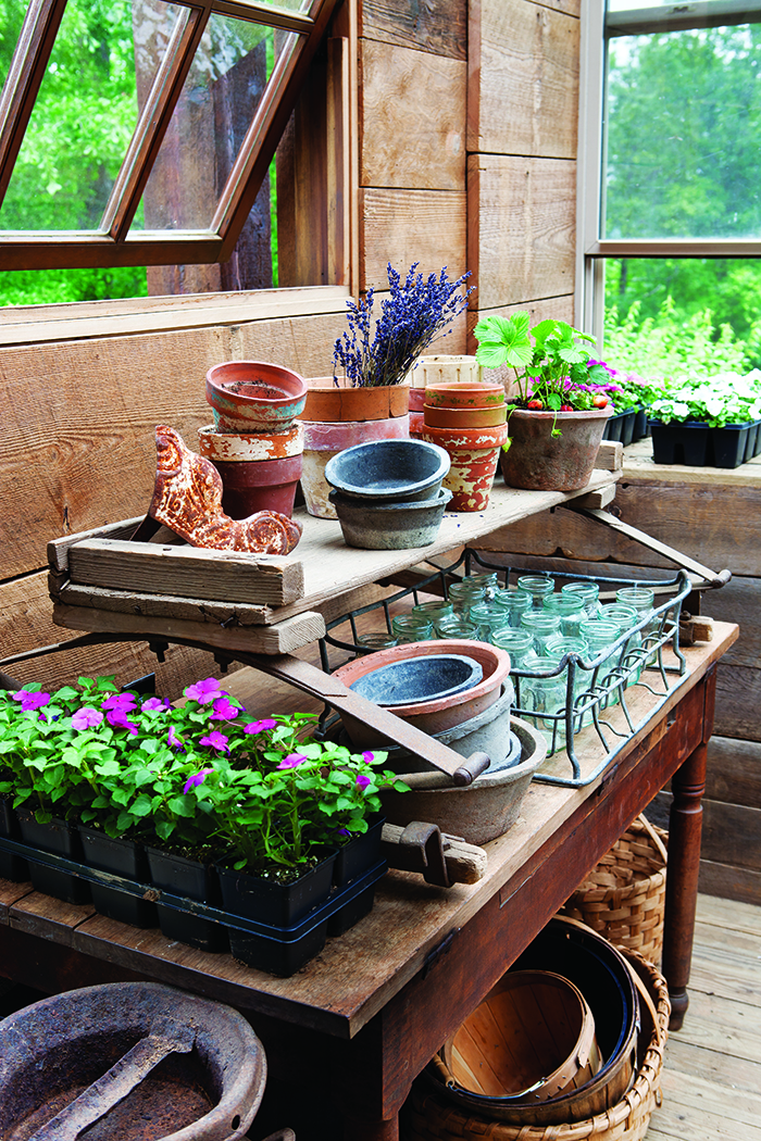 An old horse-and-buggy seat finds new purpose as a shelf for plant pots. “Old things are more meaningful when you know your ancestors used them,” says Michael. According to family memory, the buggy was struck by lightning and sat outdoors for years before Dr. Blum reclaimed it. The window above is one of two old schoolroom windows that can be tilted to control air flow.