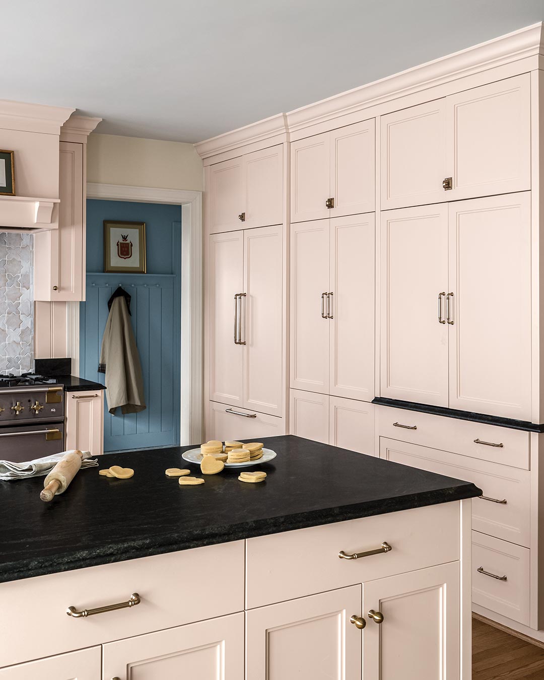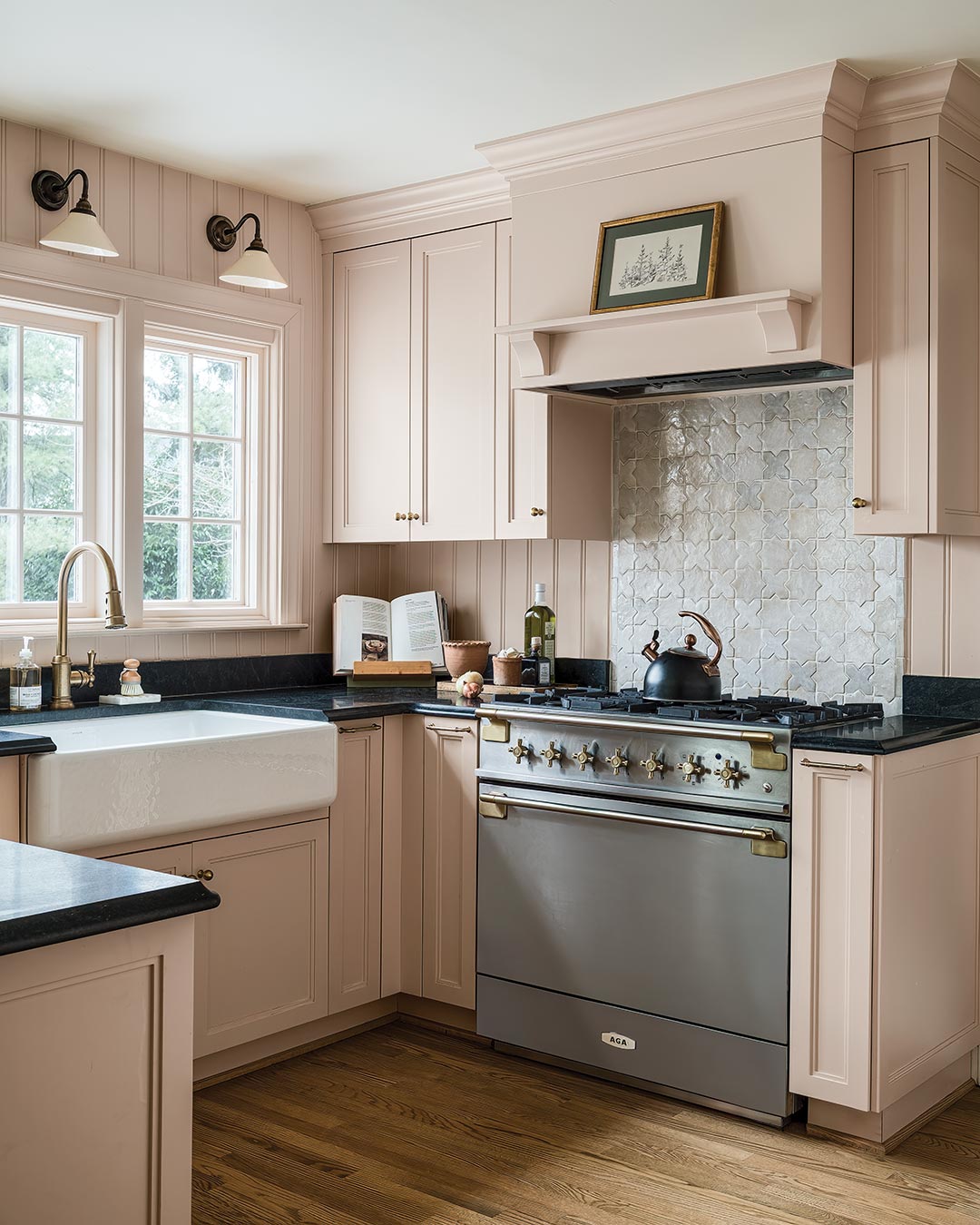 The blushing hue, with its earthy undertones, reads as a neutral, gentle in the daylight and cozy by evening. “We wanted every material in the kitchen to feel intentional and layered, so the combination of textures and finishes really drives the overall character of the space,” Samantha says. To build upon this rosy base, she chose Zellige tiles in a star-and-cross pattern for the backsplash behind the range, wide beadboard panels painted to match the cabinets, soapstone countertops, brass hardware, and a cast-iron farmhouse sink. Partnered with the pink, the look “was a bold choice,” Samantha says, “but it reflects the homeowner perfectly—confident, creative, and unafraid to take risks.”