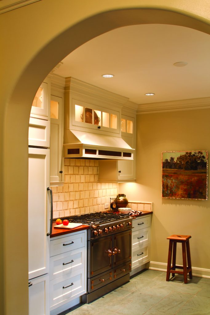 A glass-door cupboard and other cabinetry aren’t just meant for the kitchen, as this breakfast room proves. Because these built-ins and walnut counters match those found in the kitchen, a visual connection is created between the two rooms. Sealed walnut countertops and whitewashed cabinetry lend vintage appeal to the Keys’ kitchen.
