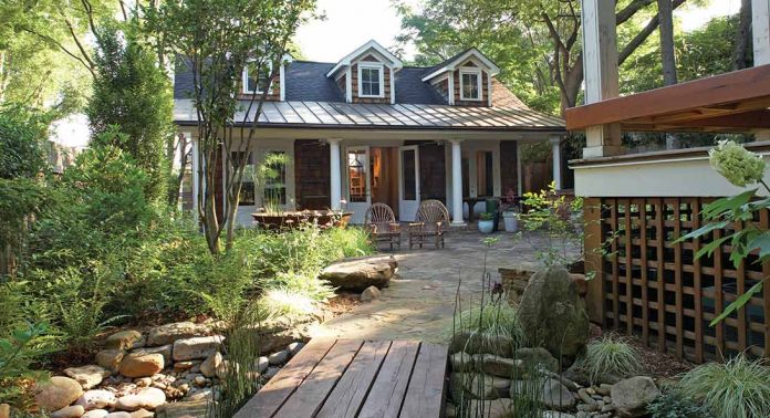 This carriage house, which serves as an at-home office, was designed to complement the main home in both design and function. Out front, an old sugar kettle has been given a sweet rebirth as a pretty pond.
