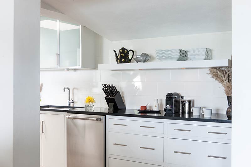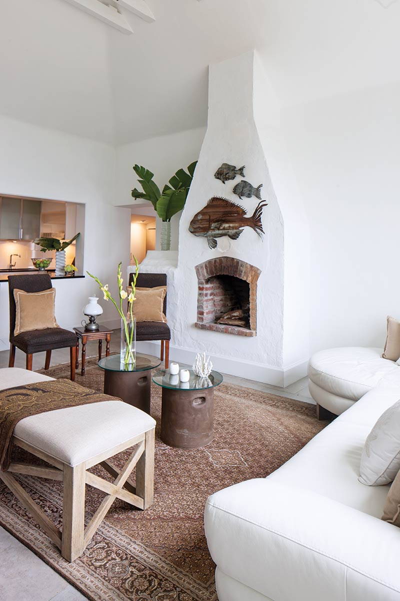 Because of the beautiful climate, much of Carol’s time is spent outdoors relaxing on her terrace and enjoying the harbor view. Stairs just beyond lead to the dock below where her favorite mode of transportation awaits, her Boston schooner.