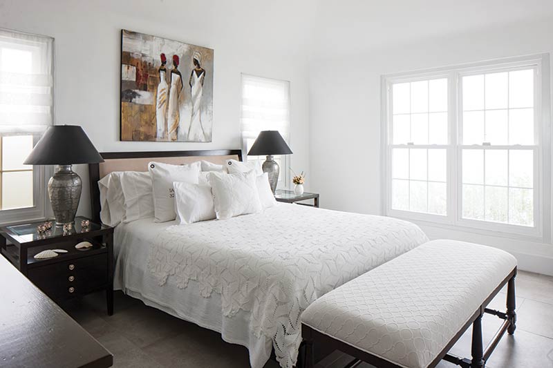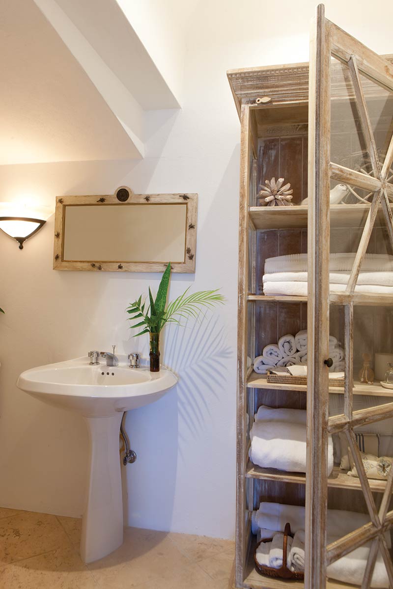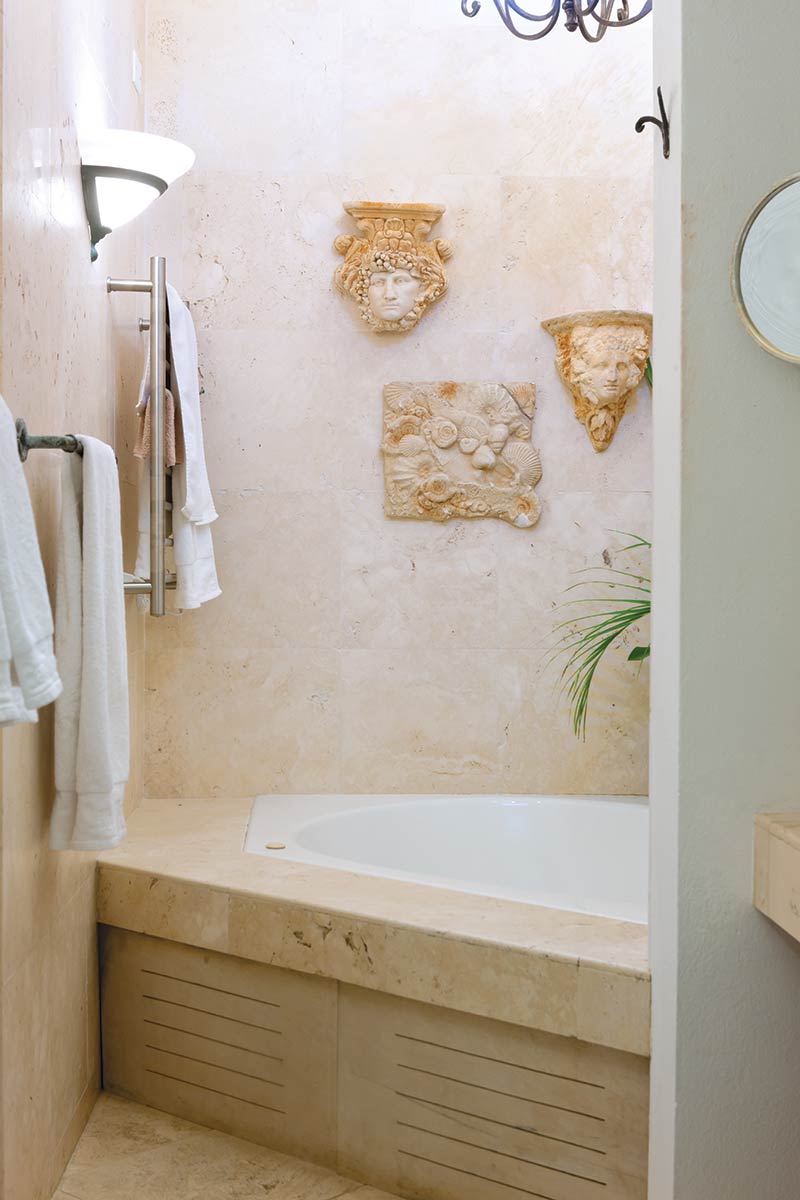 The light-filled master bedroom is just steps away from the Tuscany-styled bath. Inside the bathroom a glass-front storage cabinet filled with towels is within reach of the pedestal sink. Decorative plaques hang from the travertine surrounding the tub. All this comes together to create an inviting escape for relaxing.