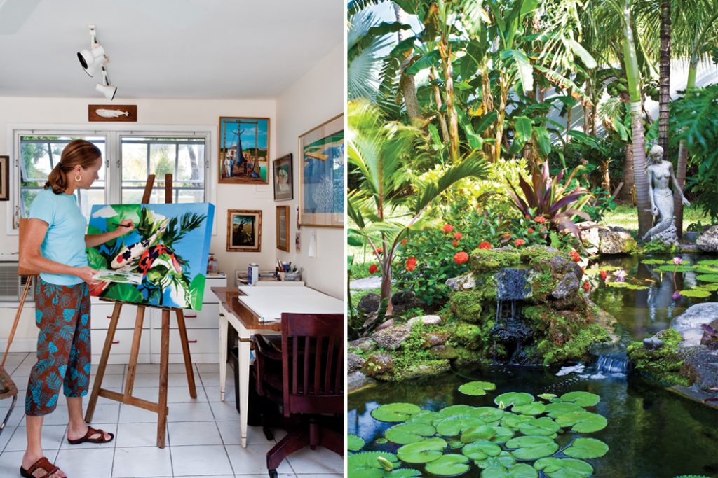 The guest cottage appears so idyllic that guests might linger well beyond the invitation. A loop constructed in the Intercoastal Waterway creates a small lagoon, and the cottage is partially built over the water, straddling it like the famous stilted guest cottages of Tahiti. Sea life constantly swims in and out of the lagoon, as guests relax on the adjacent spacious deck.