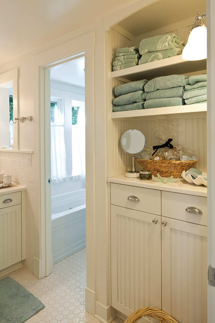 Classic Cottage on Whidbey Island July 10, 2015 FacebookTwitterPinterestWhatsApp The bright white bathroom may be petite, but it has generous storage space and a small window to let in natural light.
