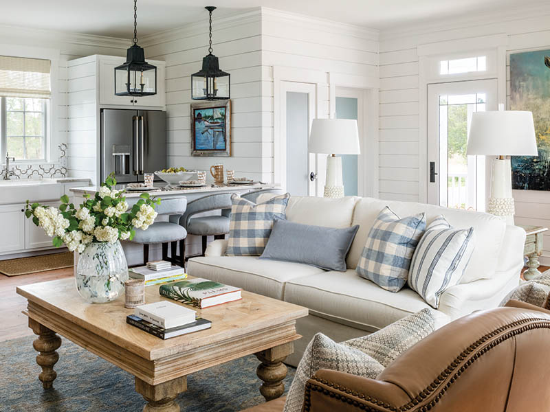 All the shiplap interiors are painted crisp white to complement the wood floors. Powdery blues play with soft creams in the color scheme while a balance of checks and stripes in accent pillows and upholstery choices build upon the theme of blending country with coastal. Performance fabric and easy-to-wipe leather are also ideal for the tidewater setting. The case goods are painted—and, in some cases, distressed—and the upholstered pieces are all about comfort.