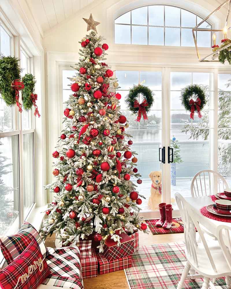 A waterfront cabin in Ontario, Canada, is packed with Christmas cheer—whether it’s the classic red-and-green combo or brilliant blue hues. An abundance of windows offers endless views of the picture-perfect wonderland outside.