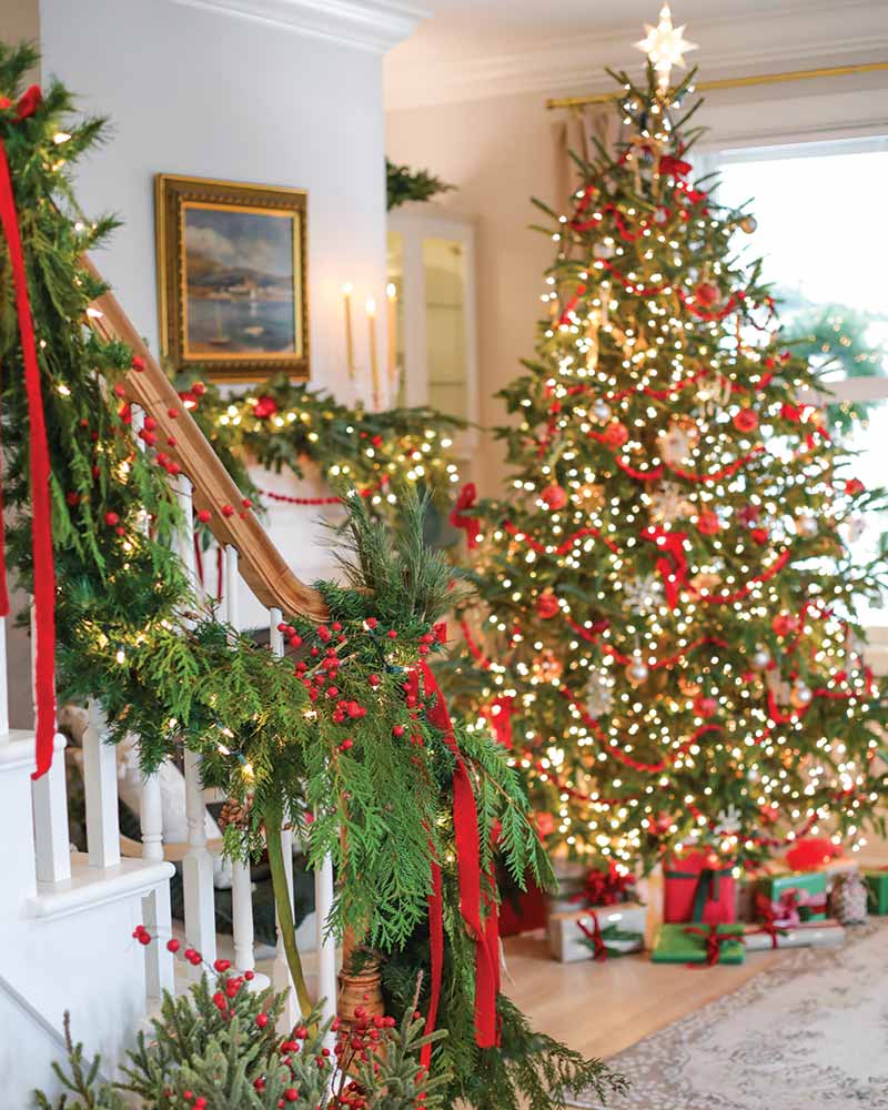 This century-old cottage was renovated with love and decorated for the season with sentimental recollections of Christmases past. An abundance of verdant swags scattered throughout the home breathe lush life into the dreamy scene.