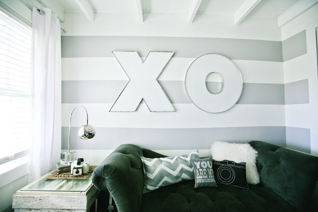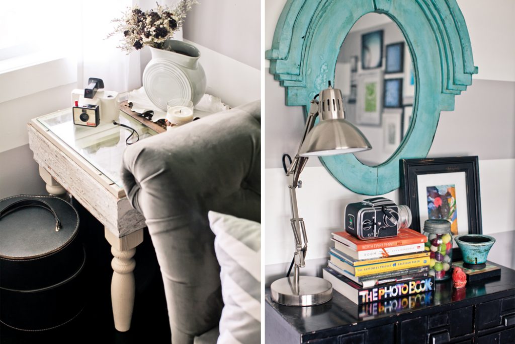 Her initial design challenge was to make 900 square feet seem more spacious. Shea and her father began with the ceiling, unveiling original beams under old drywall. Coats of white paint on the ceiling and walls created a blank canvas, instant airiness, and a striking contrast to the dyed ebony floors.
