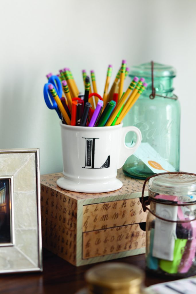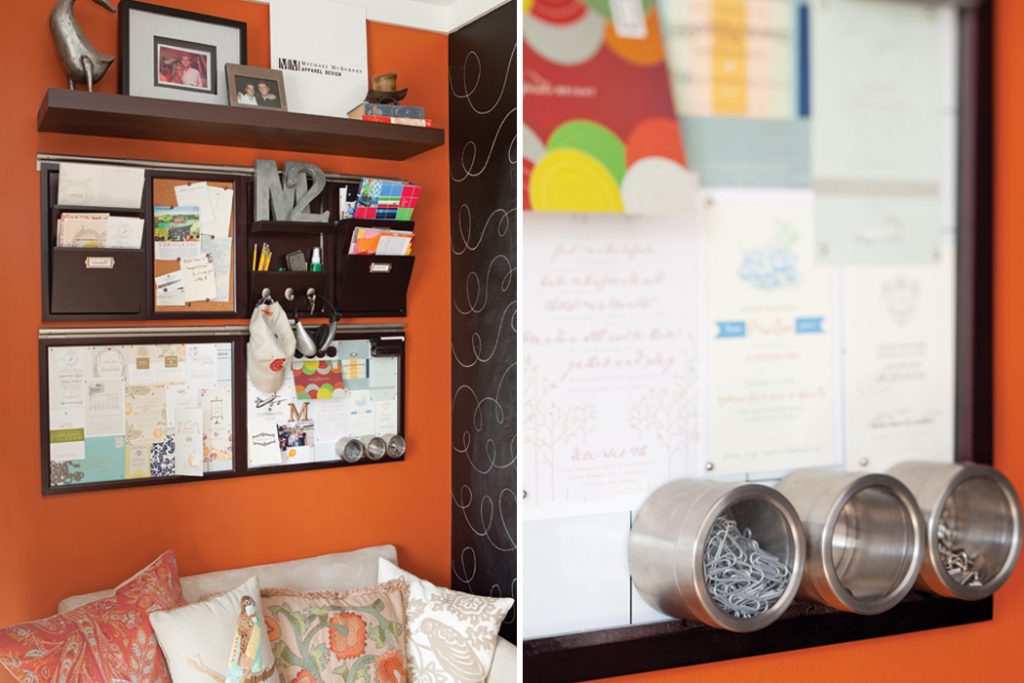 STYLE IDEA: Bulletin boards and shelves make great use of wall space and keep the desk surface free; small, similar items can be sorted into cups, boxes, and interesting jars; up, out-of-the-way, and handy, these brushed metal round boxes work for the everyday necessities of paper clips and pushpins.