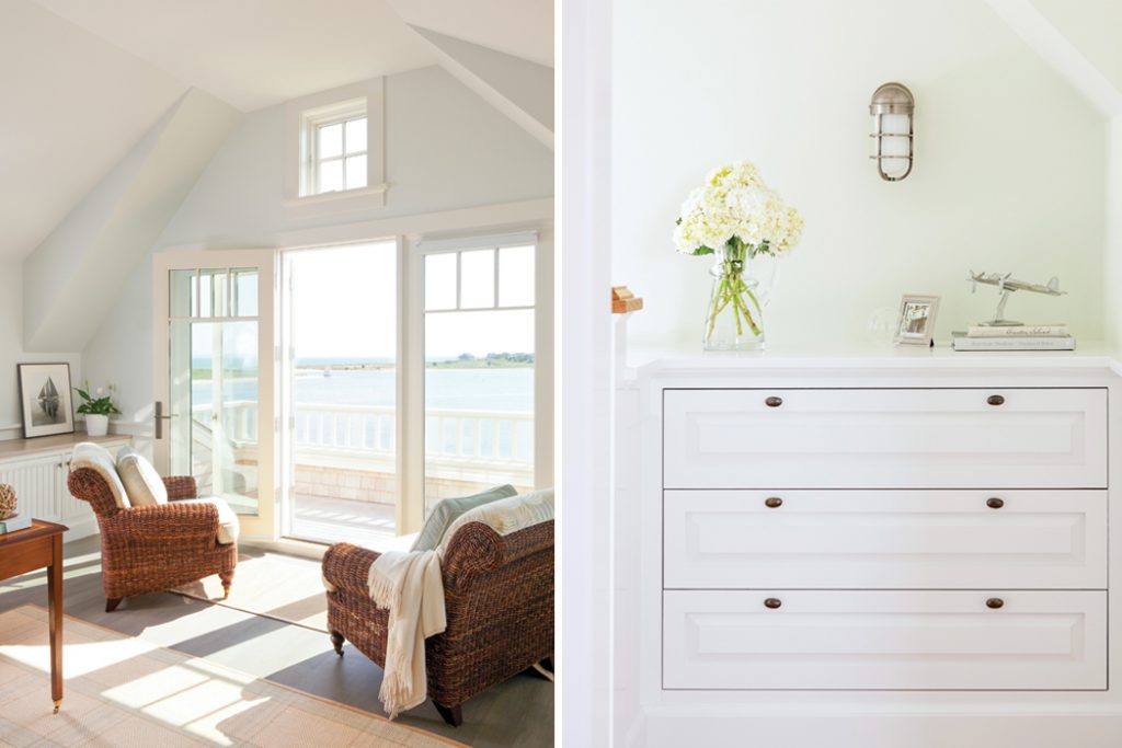 The upstairs study looks out onto a picturesque balcony where family members can soak up the sun or lounge indoors in one of the large wicker chairs flanking the doorway. Built-in shelves at the top of the stairs add convenient storage.