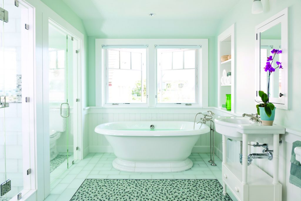 Green Harbor Cottage July 17, 2014 FacebookTwitterPinterestWhatsApp Details such as white wainscoting, pale-blue walls, and a rug-shaped inset of mosaic tiles adorn this serene bathroom.