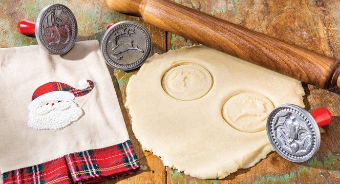 Tea towel from Mud Pie. Cookie stamps from Nordic Ware. Rolling pin from Salt Creek Mercantile.