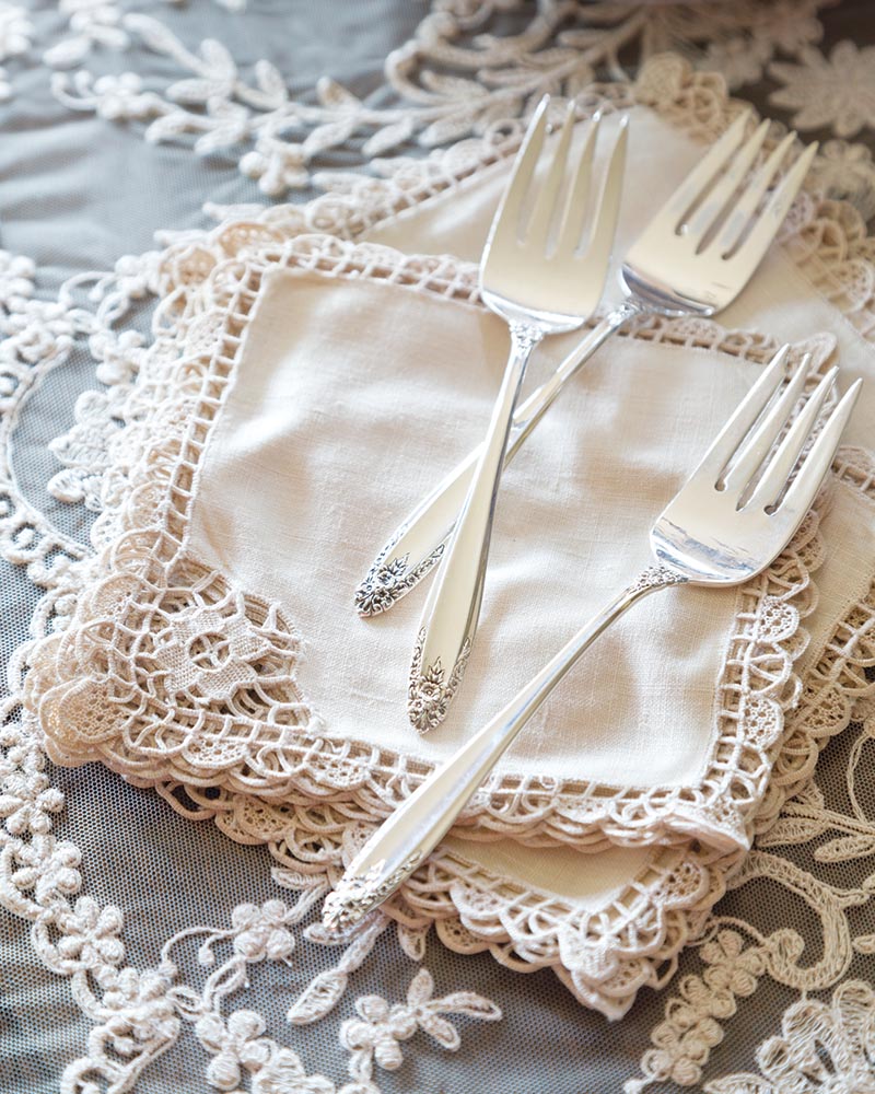 Shelly likes to fashion an eye-catching table runner by streaming doilies down its center. “They can either be placed on top of each other or lightly stitched together,” she says. If you don’t have a full set of matching napkins, set your table with several across a spectrum of the same hue and style them to accentuate their distinctive characteristics. “Roll up vintage napkins in different shades of white, cream, and off-white so the unique feature is exposed,” she says of a classic example. “Use ribbon, twine, or lace to tie them up.”