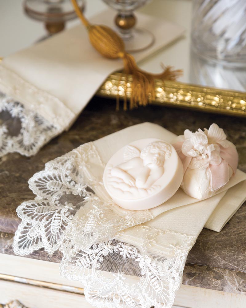 Lois recommends starting a hope chest of fine linens for children. She makes many mementos for childhood milestones, such as tooth fairy pillows, first haircut bags, baby bonnets from vintage petticoats, and christening dresses from lace tablecloths. It’s never too early to foster an appreciation for sentimental linens among the next generation.