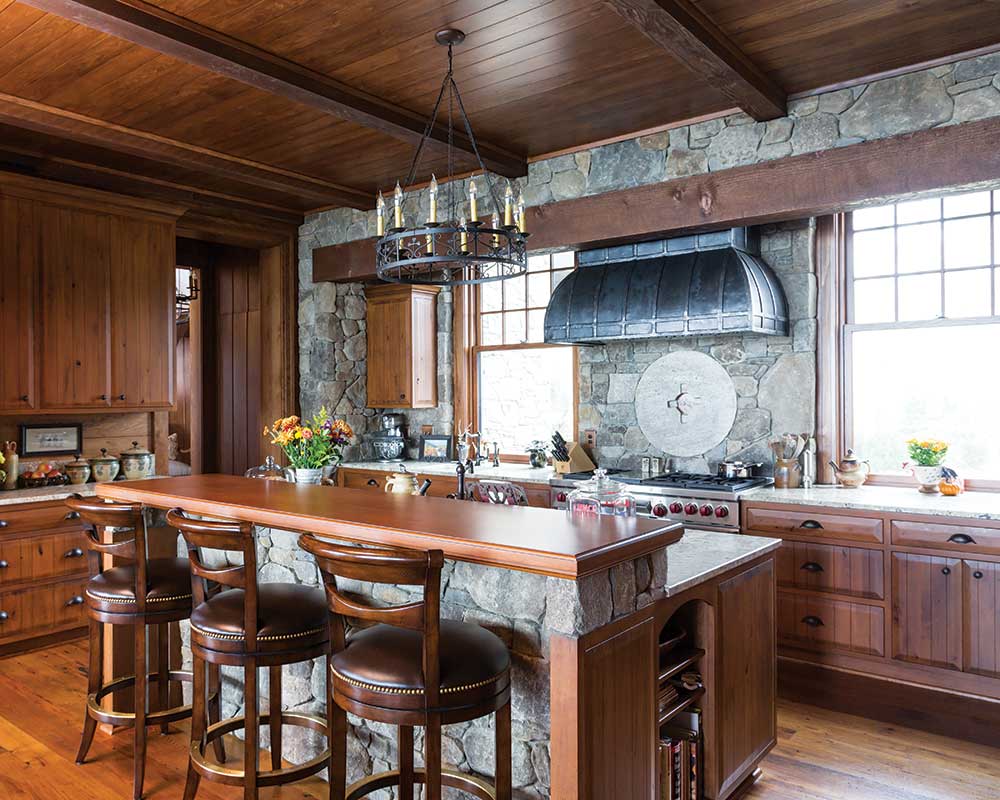 Special features that were reclaimed from the original construction include the chestnut wood that now covers the floors throughout the new home as well as the ceiling and walls in the study. The millstone that was above the fireplace in the main living room of the inn now resides above the stove in the kitchen, and the signs and keys from all the original rooms at the inn now hang on the new bedroom doors.