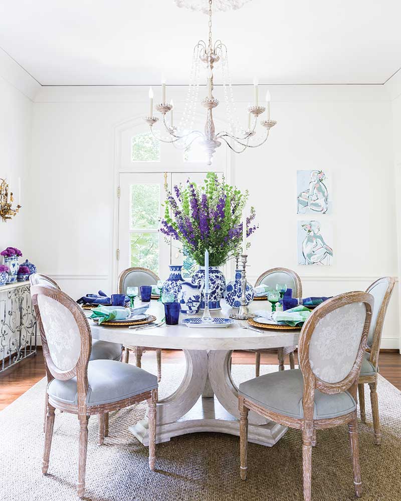 “Classically built, this home’s architecture steered away from trend,” says designer Katie Gibson of Katie Gibson Interiors, “so we knew from the start that we wanted to reflect this style in the interior spaces.” Her vision began with clean white walls, a blank canvas for traditionally lined furniture, unconventional fabrics, and plenty of pops of color. “The homeowner loves the look of French-Italian style, but she also leans toward a simple and feminine aesthetic,” Katie explains. “So, rather than overdoing patterns, we focused more on interesting textures and intentional layering.”