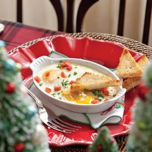 - Brush the insides of 12 small shallow gratin dishes or ramekins with softened butter. Crack 2 eggs into one dish, being careful not to break yolks. Drizzle 2 teaspoons cream around egg yolks. Sprinkle with 1 teaspoon cheese. Repeat procedure with remaining eggs, cream, and cheese. Sprinkle with salt and pepper. Place dishes on a large rimmed baking sheet.