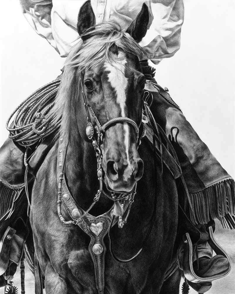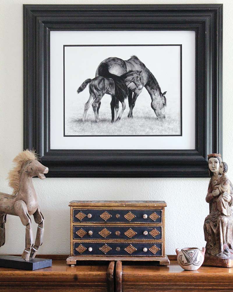 It wasn’t until Karmel was 31 and mother to her own daughter that the art world called to her again. She moved to a ranch in Elbert, Colorado, and bought some horses. Although she had not picked up a pencil and sketch pad since she was 17, she felt an easy connection to the horses and began to draw again. “To me, they are the world’s most beautiful animal,” she says. After making a quick sketch of a horse, she realized that this was what she needed to be doing and began to give a career in art a second look.
