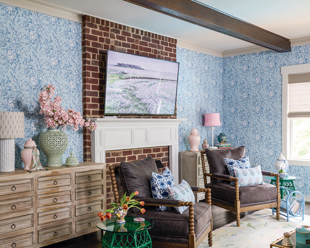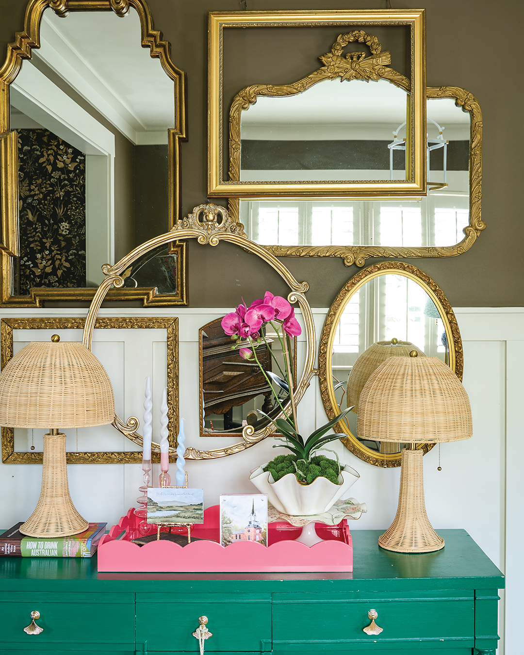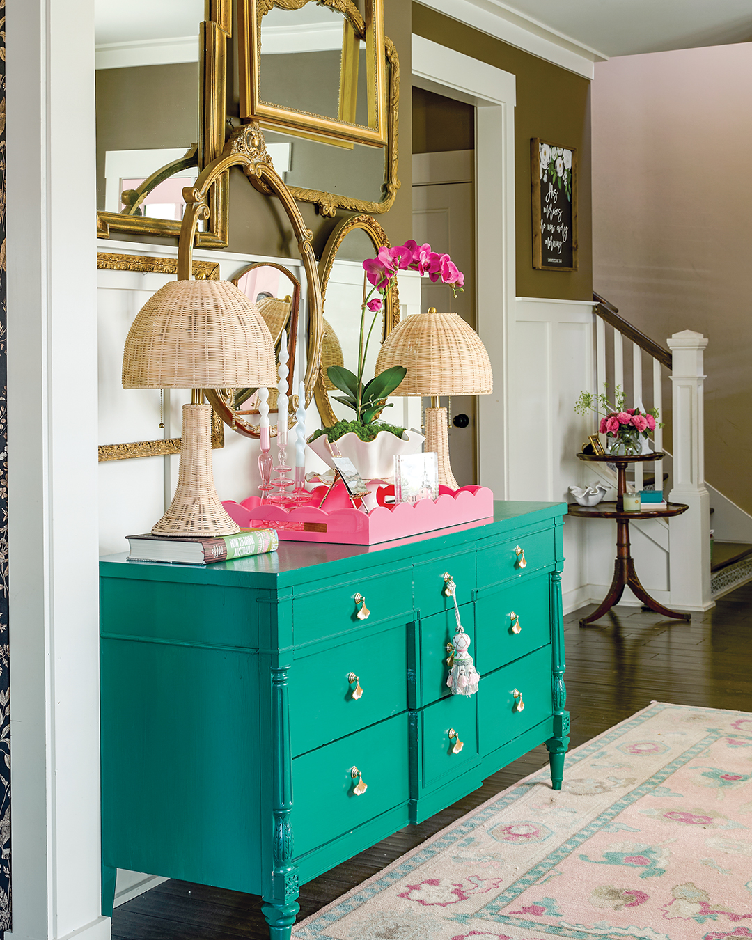 Alieta and her husband, Logan, built this Craftsman-style home in Hoover, Alabama, ten years ago. “I love change, so we’ve probably touched every room since then,” she says. A vacation in Palm Beach influenced many of her design choices in the home. Dashes of kelly green, fuchsia, and cobalt infuse the abode with striking color, while gold accents, natural wood tones, and a neutral shade of peppercorn gray keep it feeling casual.