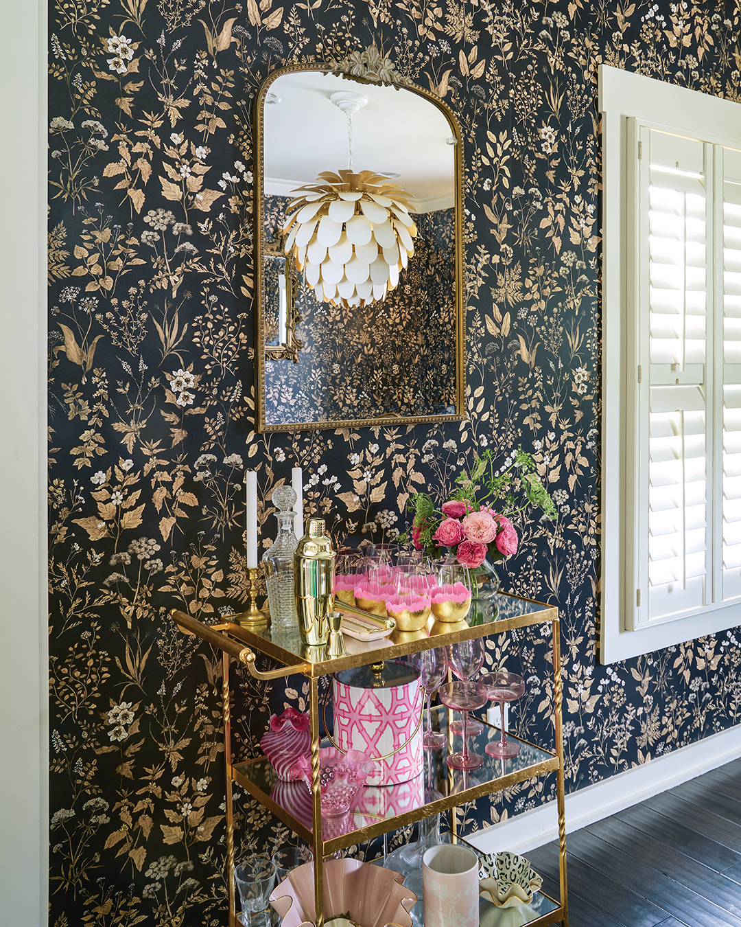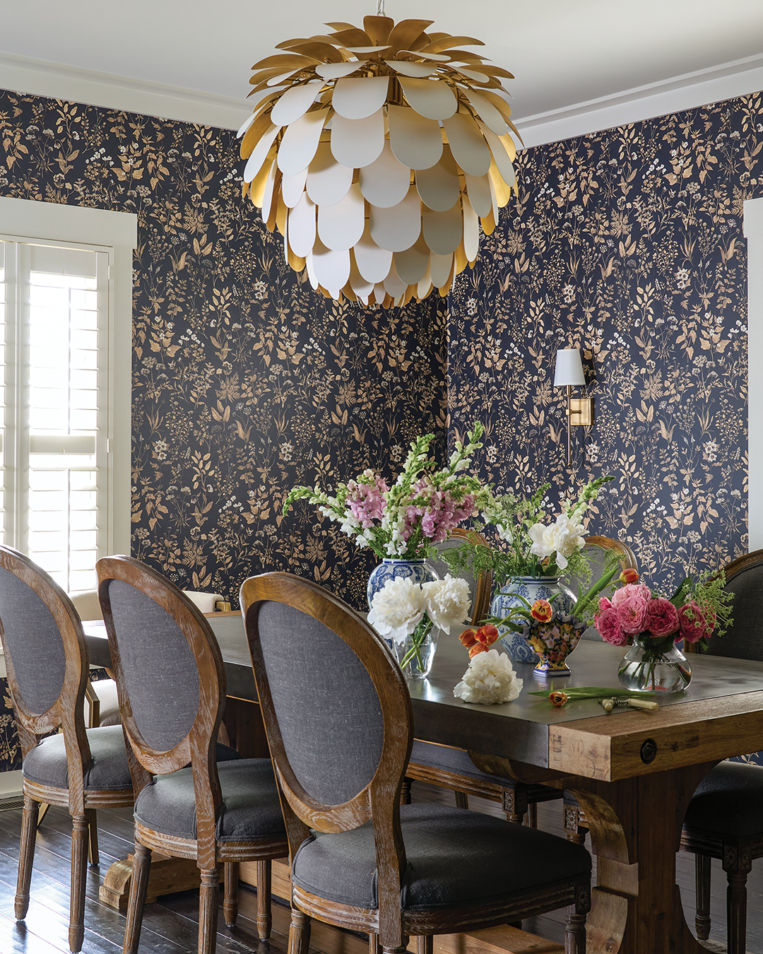 Entering the home through a rosy blush door, guests are welcomed with a statement dining room. “The dining room was the first big wallpaper project we did,” Alieta says. “Our big concrete-and-wood table was something I had to consider when choosing the wallpaper.” A bold black-and-gold floral motif graces the walls, while an oversize pendant light hangs above the table, creating a moody tableau.