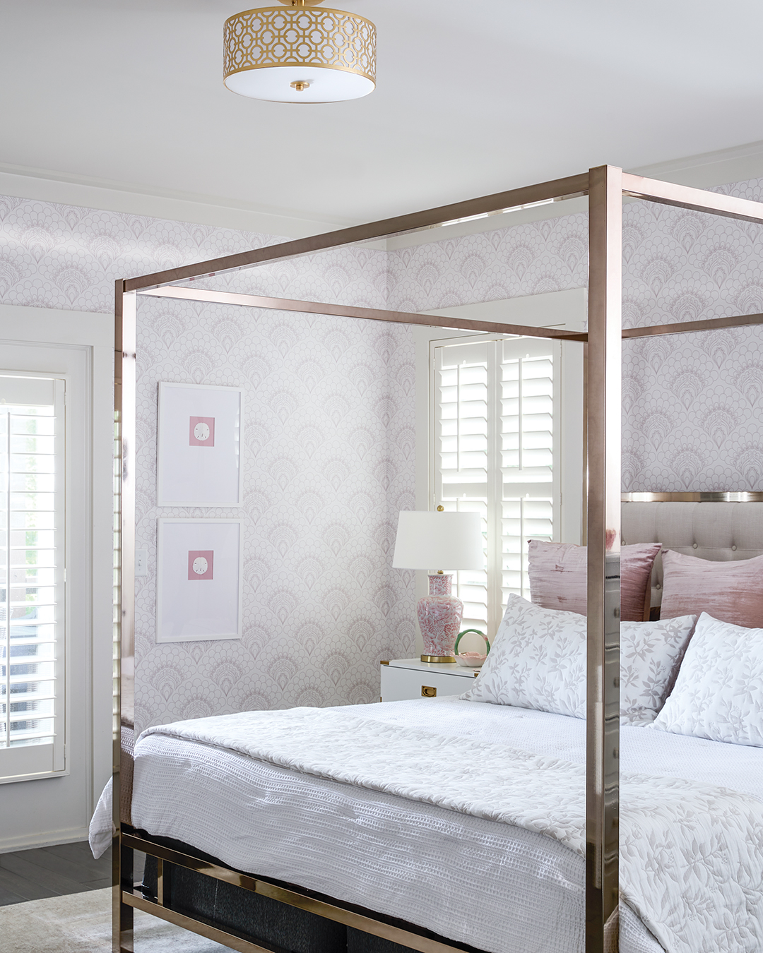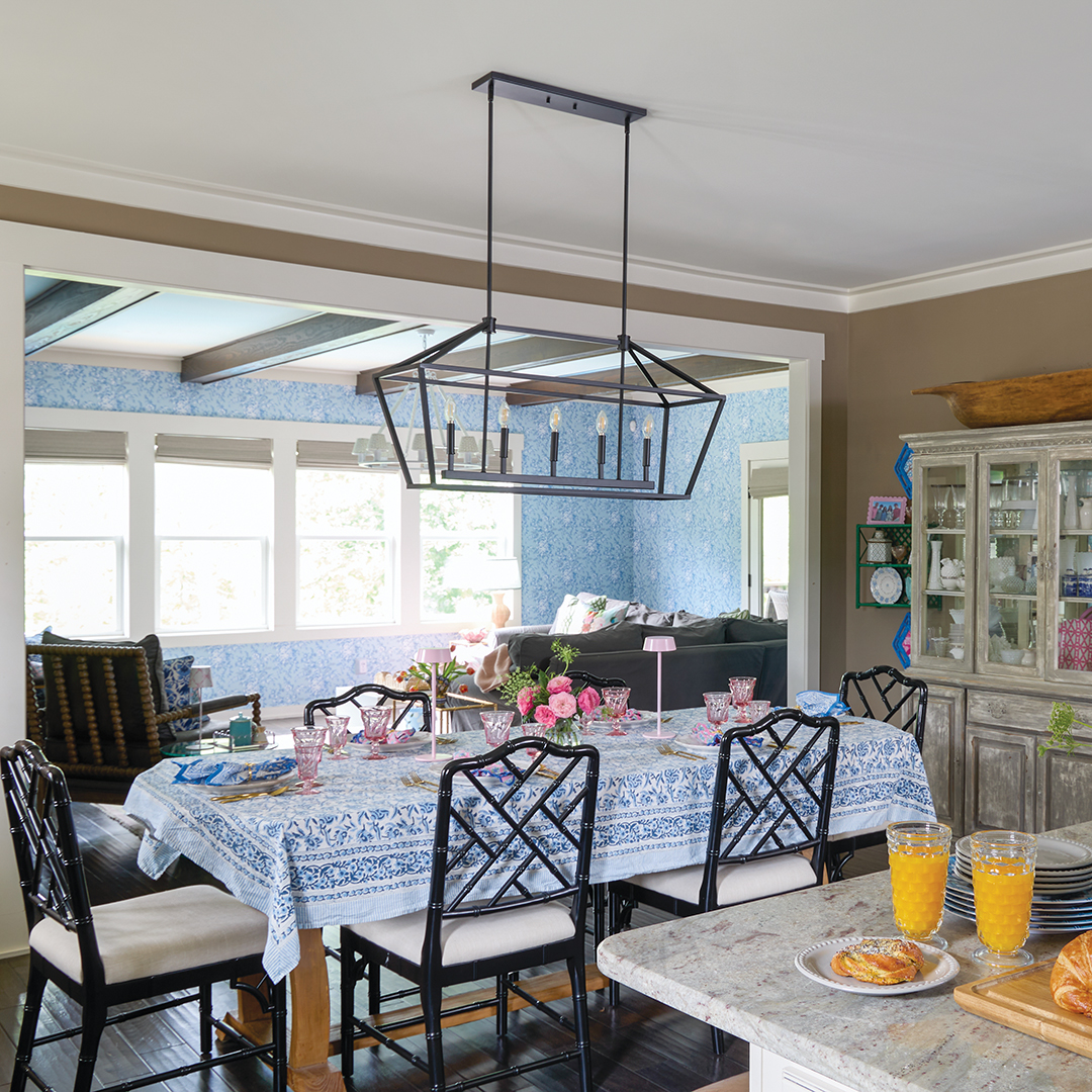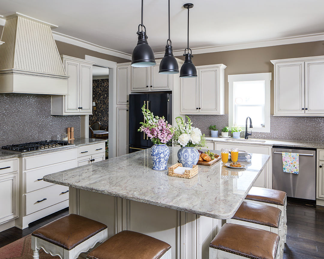 The kitchen’s neutral tones allow the brighter rooms to stand out while complementing the black-and-gold dining room. Black light fixtures over the island coordinate with the cabinet door pulls, while gold accents on the refrigerator and blue-and-white centerpieces emphasize the adjoining dining area and living room. “I love that [the kitchen] ties it all together,” Alieta says. “It helps the flow between rooms.”