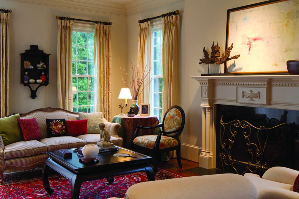Typically known for her traditional décor, Deborah infused a number of fanciful details throughout her current home. “In small doses, whimsy is fun, not corny,” she promises. She built a larger-than-life wingback chair, cut in an exaggerated Alice in Wonderland style, which anchors a charming reading nook in the upstairs hallway.