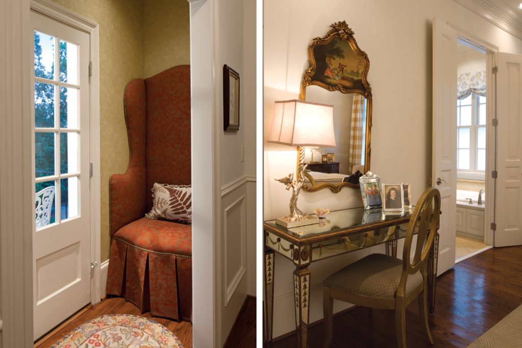 Another crafting accomplishment is the mercury-style finish of the glass in the master bathroom cabinets. Using a simple technique involving vinegar, water, and a spritz of bronze paint, Deborah created a striking complement to the room’s Jerusalem gold marble.