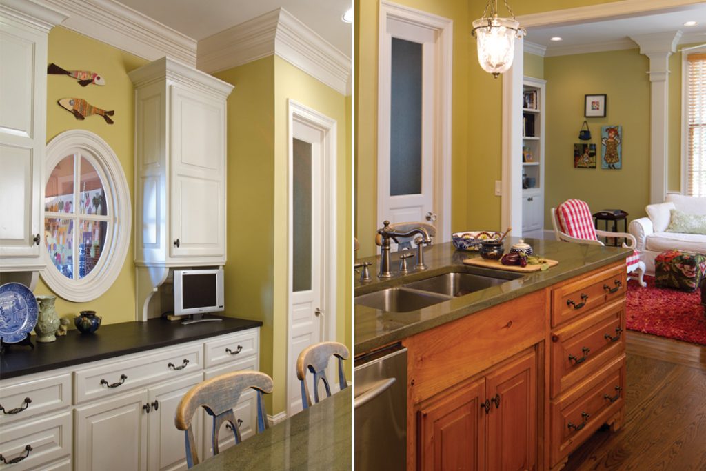 The kitchen is another space where an infusion of white lends a spacious and comfortable ambience. “Here we balanced the timeless white cabinetry with casual knotty pine and a fun, colorful tile,” explains Deborah, proving that with classic pieces in place, a home can strike the artful combination of polish and personality.