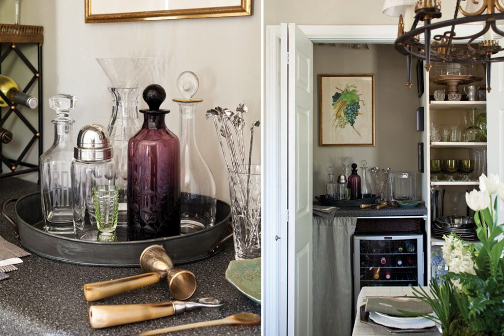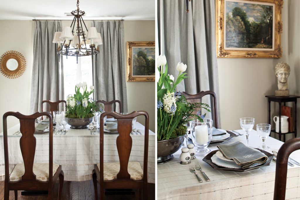 Columns separate the living and dining rooms, giving the front of the home an air of openness. “There’s a little bit of space separation, but it’s still just one big room,” Harriet says. To help the room feel larger than it is, Harriet capitalized on the natural light that pours through the large windows and furnished the space with neutral, beige-colored pieces. “I just wanted to keep it light and airy to open up the space as much as I could, but I still wanted it to look cozy, so I added some pretty drapes, a pop of color in the pillows, and natural artwork,” she says.