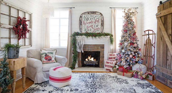 During the holiday season, nearly every surface and styled vignette gets an extra dose of comfort. “Christmas is all about the cozy family fun,” Charlotte says. “We love to spend time baking and watching Christmas movies by the fire.” The living room is a place where the family spends lots of time together, so the flocked tree decked with farmhouse ornaments and surrounded by tartan plaid packages and a vintage sled truly sets the scene for a cozy Christmas morning. “We love to have the fireplace going while watching our favorite holiday movies or just hanging out, drinking coffee or hot cocoa,” Charlotte says.