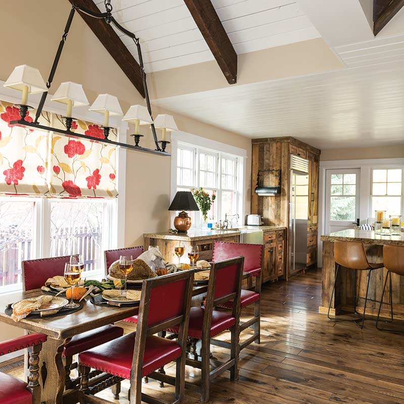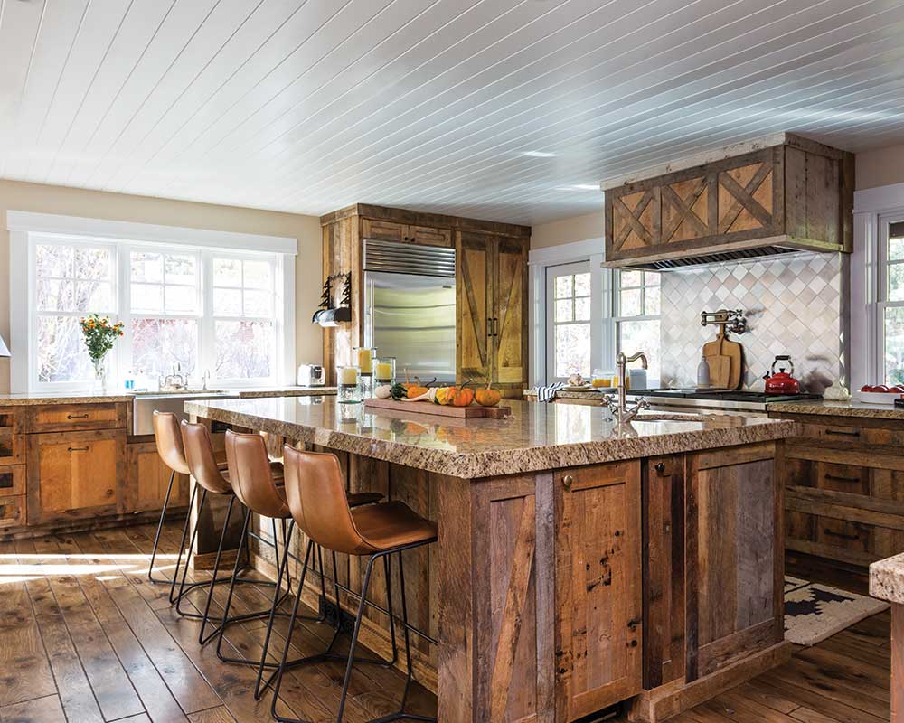 The warmth of the color palette is made cozier by the ample, varied textures used in the design, like the barnwood cabinets in the kitchen. While the couple originally considered all-white cabinets, the home’s rustic surroundings made it clear the choice would have been a mistake. “They’re only going to get better with age,” Katie says of the cabinets.