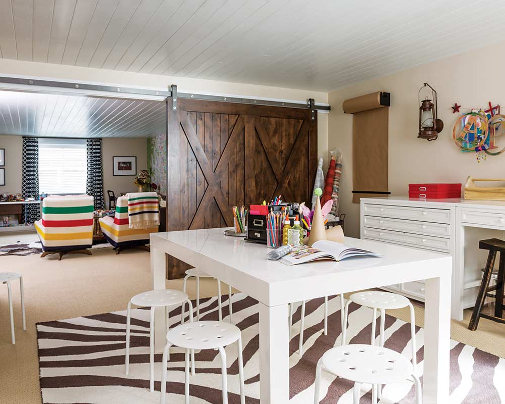 Downstairs, the Confers were faced with yet another puzzle—that of creating the ideal space for visiting friends and family. Despite the contractor’s hesitation, Katie knew that she wanted a guest suite that adjoined the family’s media room. “We opened up the windows and we added the texture of the shiplap ceilings and made the flow of the basement open up,” she says.