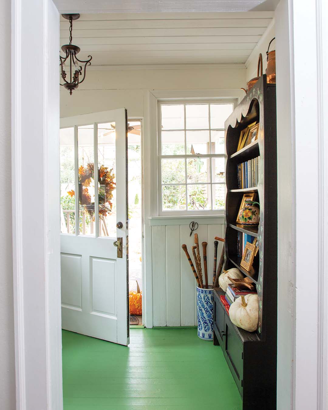 Her eye for design shines in details like the bright green paint she selected for both the built-ins in the dining room and the floor in the back entry. “It makes me happy every time I walk in the back door,” she says. Formerly the location of the washer and dryer, the makeshift mudroom now serves as a welcoming sight complete with a bookshelf Beth painted herself.