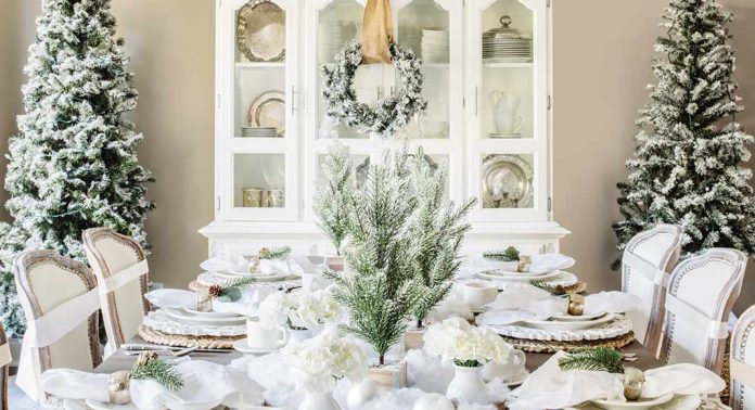Other than fairy lights, which Marly uses on all her trees, and choice ornaments in neutral white, silver, and taupe to match the home’s décor, the family room Christmas tree was flocked in a unique, economical way. “I created this ‘snow-filled’ Christmas tree by tearing open some old pillows and adding chunks of the stuffing throughout the tree. It was quick, easy, free, and ultimately created the look of a snowy Christmas tree,” she says. Additional pillow stuffing is paired with mini trees to create a festive centerpiece on the dining room table, creating a snowy landscape of sorts. Once the places are set, the effect is magical.