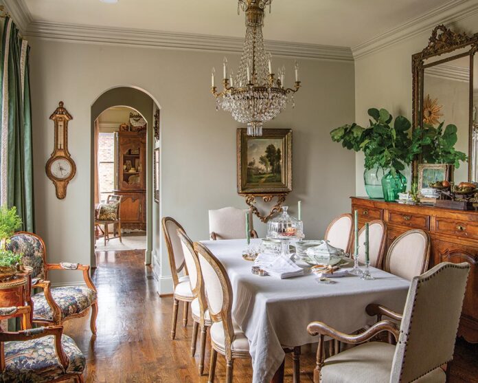 In the dining room, the home’s neutral palette is layered with saturated green tones, cultivating more of a manor house aesthetic that draws its inspiration from tapestries. The armchairs by the window enhance this theme as rich wood furnishings impart warmth. On the buffet, an antique scale lends storied charm while the oil landscape is a token from Melissa’s trip to Ireland. “Every time I travel to a new country, I purchase an oil painting so that I have one piece of original art from my travels,” Melissa notes. Adding a final French flourish are an antique barometer and crystal sack-of-pearls chandelier.